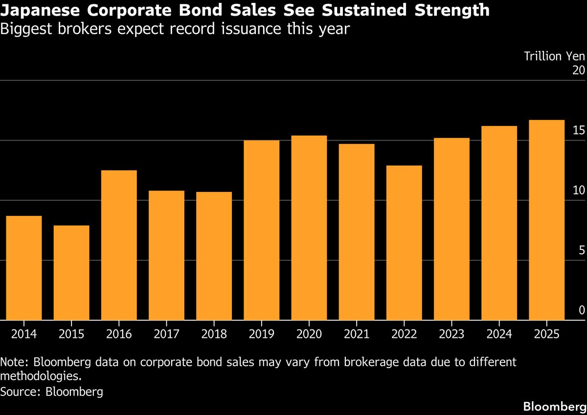 Corporate bond issuance in Japan is poised to breach a record this year on growing funding demand for mergers and acquisitions as the economy continues to move away from three decades of deflation.